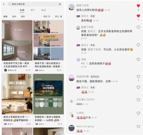 于是,我在小红书上面搜“墙面配色推荐”出来了很多网红色,在众多的网红色当中,美涂士2022年八大网红色尤为凸显,收获满满的好评。而且凭借着年轻人家居配色的属性,美涂士网红色不仅成为了小红书上点击率颇高的存在,更是受到了小红书各大网红的青睐,一度成为了年轻人讨论的热点。
