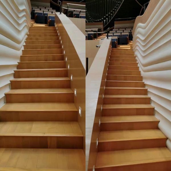 南通大剧院步道区域的地板,均选用了由安信地板提供的三层实木复合橡木板。从材质及工艺来看,实木复合橡木板质量稳定可靠,适合作为步道区域地板主材,耐踩踏,耐磨损,不易变形。同时易于清洁打理,护理方式简洁,护理后光亮如新。安装简单,无需地龙骨,非常适合大面积铺设。从颜值外观来看,橡木木纹高雅大气,色泽饱满,纹路清晰花色给人以美感。不仅有径向切割纹理,木纹具有不规则的深浅直线条,纹理清晰、顺畅,富有立体感;还有旋向切割纹理,木纹具有山纹或波浪纹线条,纹理华丽、起伏,富有动感。从环保性来看,三层实木复合橡木板具有强化复合地板安装保养方便的优点,避免了强化复合地板甲醛释放量偏高、脚感生硬等弊端。非常适合于大空间公共区域铺设。