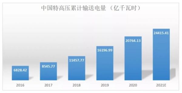 另据国家电网数据统计,2016-2020年国家电网特高压跨区跨省输送电量逐渐增长,增长幅度有所加大,2020年国家电网特高压跨区跨省输送电量达20764.13亿千瓦时,预计2021年国家电网特高压跨区跨省输送电量达24415.41亿千瓦时。