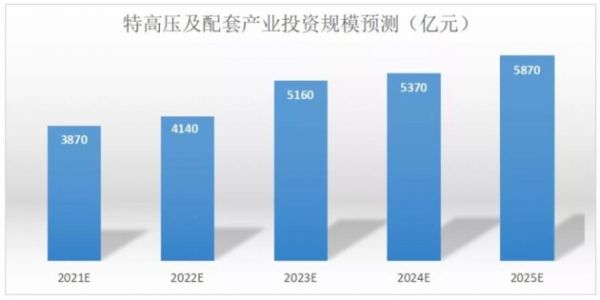 根据中商产业研究院数据显示,2020年我国特高压产业及其产业链上下游相关配套环节所带动的总投资规模超3000亿元,其中特高压产业投资规模近1000亿元,带动社会投资超2000亿元。到2022年,中国特高压产业及其产业链上下游相关配套环节所带动的总投资规模将达到4140亿元;到2025年,特高压产业与其带动产业整体投资规模将达5870亿元。