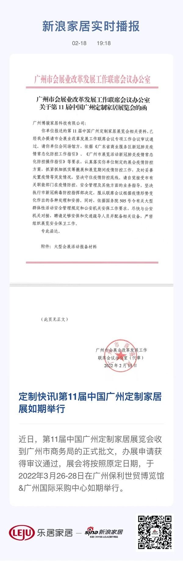 新浪定制频道讯 近日,第11届中国广州定制家居展览会收到广州市商务局的正式批文,办展申请获得审议通过,展会将按照原定日期,于2022年3月26-28日在广州保利世贸博览馆&广州国际采购中心如期举行。