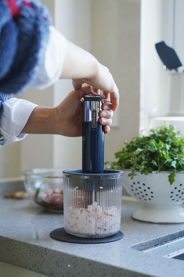 饺子作为传统美食,逢连过节必不可少。我家孩子们经常隔三差五吵着闹着要吃饺子,饺子虽好吃有营养,制作过程却并不轻松,手动剁馅和佐料繁琐又累人;用只有一个绞肉碗的绞肉机制作肉馅和酱料会有生熟混合的健康隐患,及时频繁换洗也会产生串味问题。家里的绞肉机是有线操作,制作过程还要迁就电源插座位置,每次想加点佐料都要跑到厨房操作,一想到这些,本来想好好做一顿饺子餐都变得有心无力。