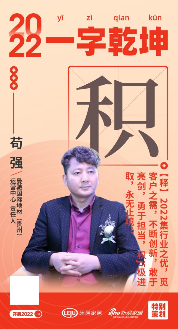 在“2022一字乾坤”活动中,贵曼驰国际地材(贵州)运营中心责任人 苟强用「积」表达了2022年的规划和目标: