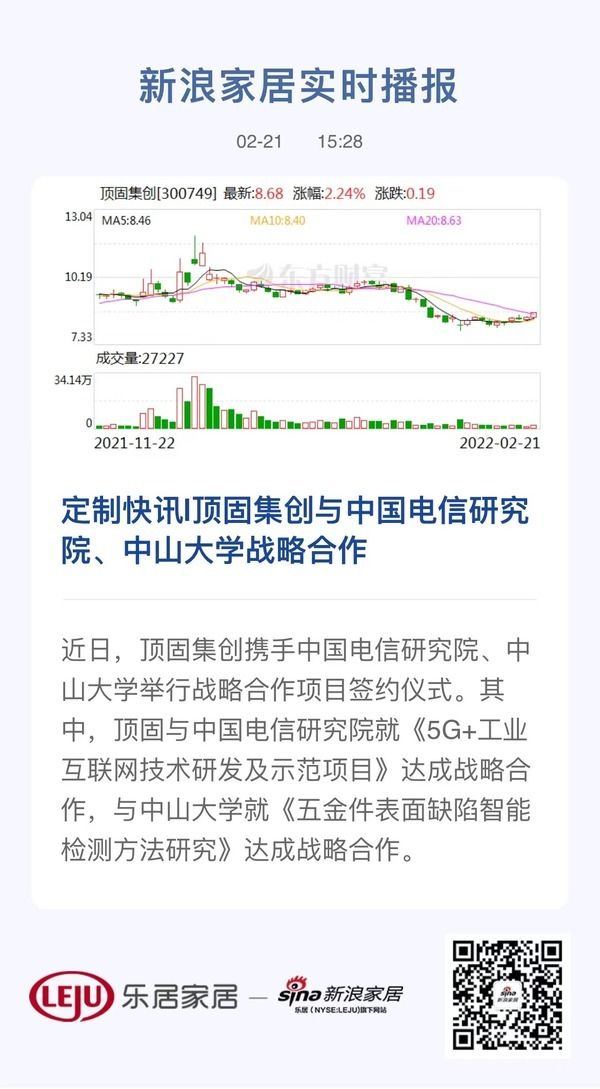 新浪定制频道讯 近日,顶固集创携手中国电信研究院、中山大学举行战略合作项目签约仪式。其中,顶固与中国电信研究院就《5G+工业互联网技术研发及示范项目》达成战略合作,与中山大学就《五金件表面缺陷智能检测方法研究》达成战略合作。