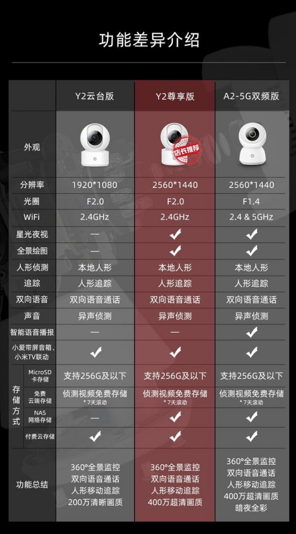 Y2尊享版则是在云台版基础之上升级400W像素,拥有2.5K超清画质,2560*1440分辨率,画面还原更加真实,是细节控的福音。并且搭配BSI背照式星光级图像传感器,全彩夜视,不惧黑夜。综合来看可以说是性价比之王款。