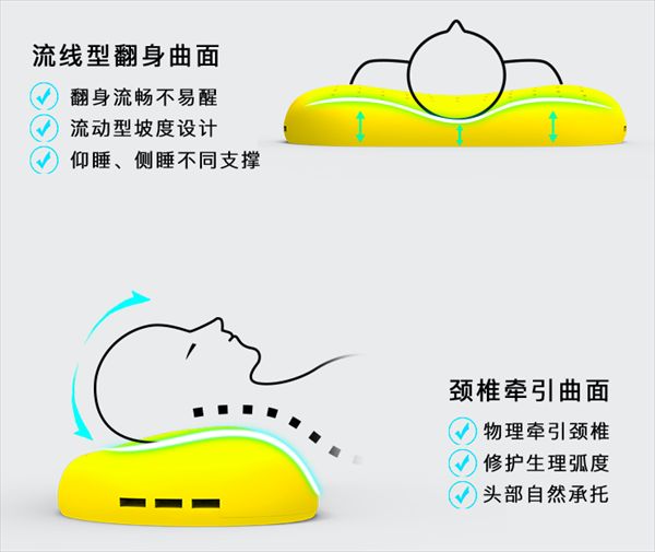不同于传统枕头单一的方形与圆形,寝素眠备长炭枕的造型是结合人体工学研究后设计出的独特造型,六大工学分区合理搭配,让这款护颈枕的弧度与各部位的高度,能让人在仰睡时保持正常生理曲线,而在侧睡时,颈椎、胸椎、骶椎形成一条直线,极大程度降低睡眠时的颈椎压力。一力降十会,从最简单的需求入手,达到科学护颈的目的。