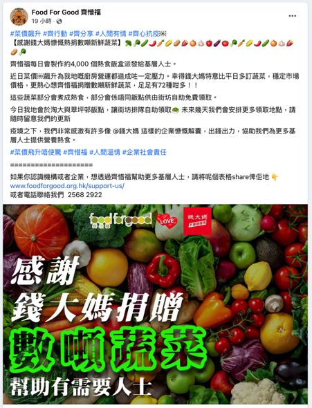 作为一家为广大消费者提供高品质生鲜蔬菜等食材的企业,钱大妈积极承担企业社会责任,紧急调配物资资源,向香港地区的慈善机构“齐惜福”捐赠了2.7吨生鲜蔬菜,包括娃娃菜、菜心、芥蓝和胡萝卜等72个品种,希望能够尽一点微薄之力,助力香港抗击疫情。
