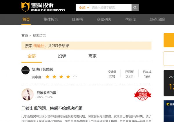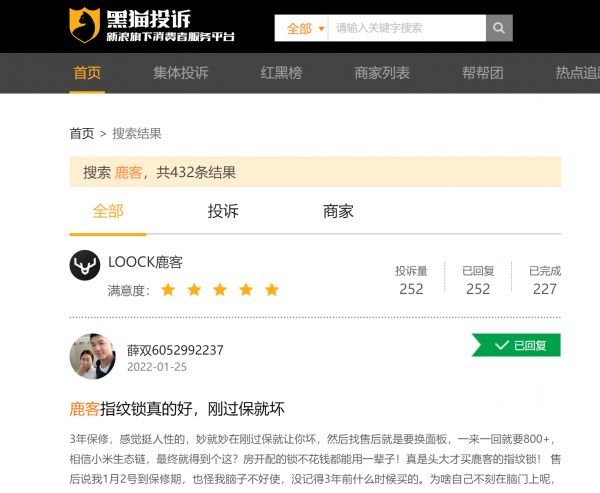 2月21日,在黑猫投诉官方网站搜索关键词“智能锁”,显示结果1387条结果,其中LOOCK鹿客和凯迪仕智能锁的投诉量分别达到了252条和227条,统计2022年以来不足两个月的时间的数据,两个品牌分别有9条和24条投诉记录。其中LOOCK鹿客的投诉中已显示全部回复,已经处理完成的有227件,尚未处理完成25件,而凯迪仕智能锁方面已经回复226条,已完成170条,可以计算尚未解决投诉量57条。