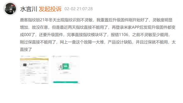 关于LOOCK鹿客的投诉大多集中在指纹识别层面,ID名为“薛双6052992237”的消费者直言,“3年保修,感觉挺人性的,妙就妙在刚过保就让你坏”,无独有偶,消费者“水言川”的投诉也很类似,他提到,“鹿客指纹锁21年冬天出现指纹识别不灵敏,我重置后升级固件刚开始好了,灵敏度明显增加,故没在意,但是最近两天指纹直接不能用了”,并且也指出“过保就不能用,太直接了”。