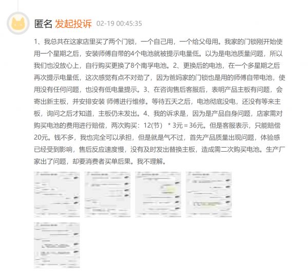 一位消费者在2月19日的投诉中将自己的遭遇可以说写的非常详细,他提到自己在凯迪仕品牌购买了两把门锁,一把自用,一把给父母用,正可谓没有对比就没有伤害。自用的一把从安装开始就已经出现了电量不正常的现象,经过短暂的使用加之与父母使用的同款产品之间的对比,更加确定了产品本身的质量问题。当然,产品出现质量问题是令这位消费者苦恼的很大的原因,但更令他气愤的则是与客服之间的沟通以及品牌在处理问题时的效率。