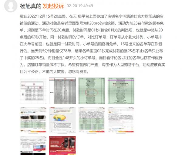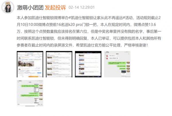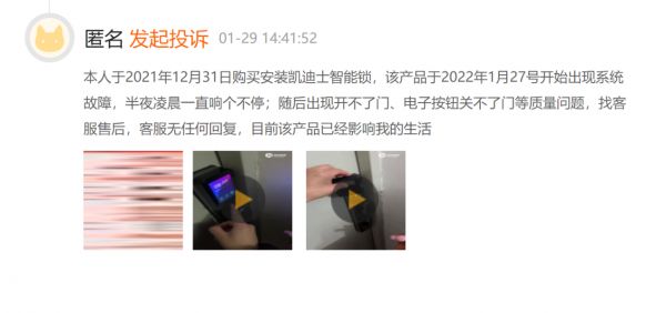 另一位消费者所反映的问题,可以说为品牌售后跟不上提供了又一佐证,他表示,“本人于2021年12月31日购买安装凯迪士智能锁,该产品于2022年1月27号开始出现系统故障,半夜凌晨一直响个不停;随后出现开不了门、电子按钮关不了门等质量问题,找客服售后,客服无任何回复,目前该产品已经影响我的生活。”可以看出,相比于产品质量问题,消费者对于客服以及品牌的不作为更为不满。在查看众多的投诉事件中,关于售后服务、客服响应的问题不在少数,对于消费者而言,投诉不是目的,最重要的是当消费者选择了这个品牌之后,品牌是否能够给予他们保障,品牌能否真正成为大众品牌乃至国民品牌被消费者所认可、所信任。令人遗憾的是,在凯迪仕智能锁的投诉中竟然有多条提及到活动获奖名单造假问题,其中涉及到1月4日、2月10日、2月15日等多次促销活动,消费者通过官方发布的获奖名单编号以及多次获奖ID等信息的对比,向商家提出质疑。