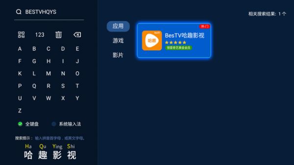 进入当贝市场,找到搜索界面,搜索“HQYS”,遥控器选择右边对应的应用软件,选择安装,完成后打开应用就能观影想看的影片了~
