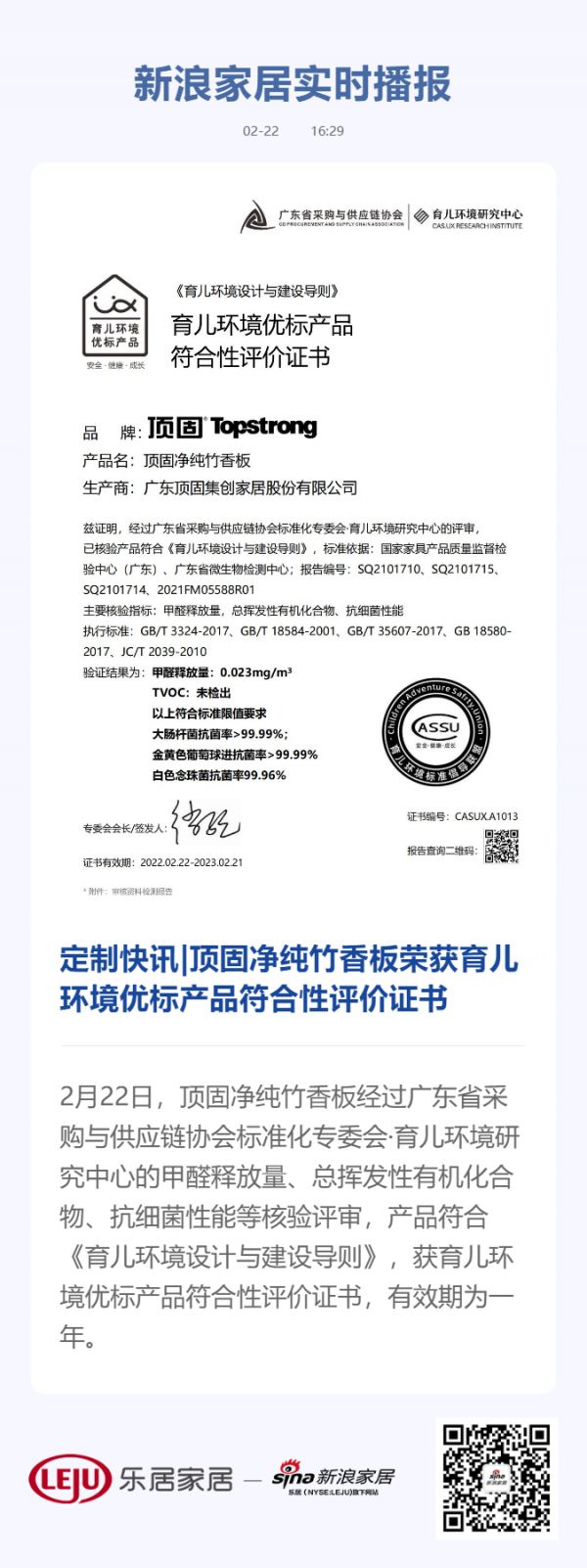 2月22日,顶固净纯竹香板经过广东省采购与供应链协会标准化专委会·育儿环境研究中心的甲醛释放量、总挥发性有机化合物、抗细菌性能等核验评审,产品符合《育儿环境设计与建设导则》,获育儿环境优标产品符合性评价证书,有效期为一年。
