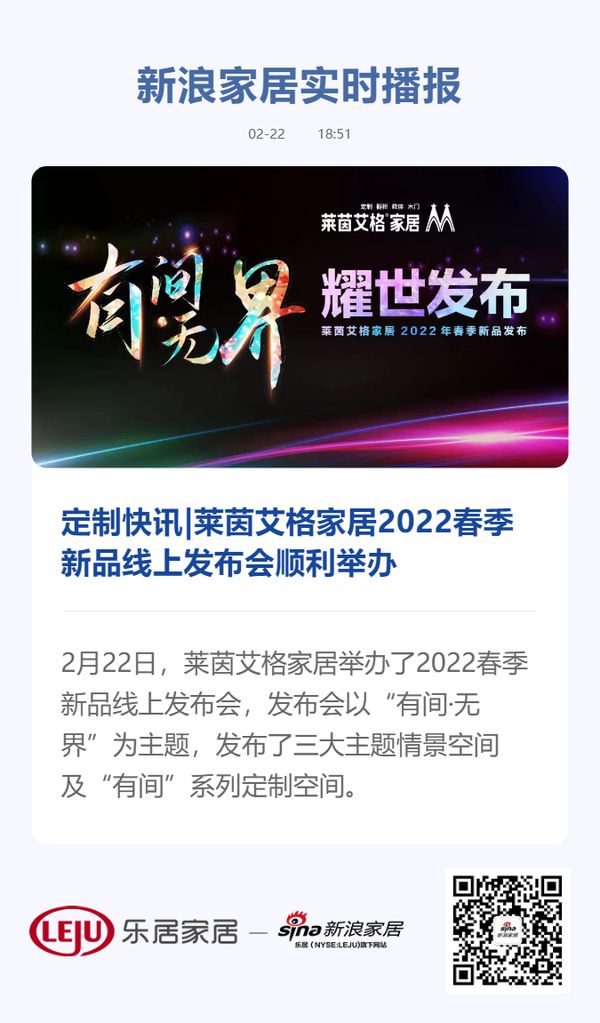新浪定制频道讯 2月22日,莱茵艾格家居举办了2022春季新品线上发布会,发布会以“有间·无界”为主题,发布了三大主题情景空间及“有间”系列定制空间。