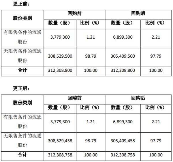 新浪定制频道讯 2月22日,志邦家居股份有限公司发布更正公告。表示。公司事后自查发现,因工作人员失误,公司披露的上述文件中“二、回购方案的主要内容”之“(八)预计回购后公司股权结构的变动情况”部分内容存在笔误。