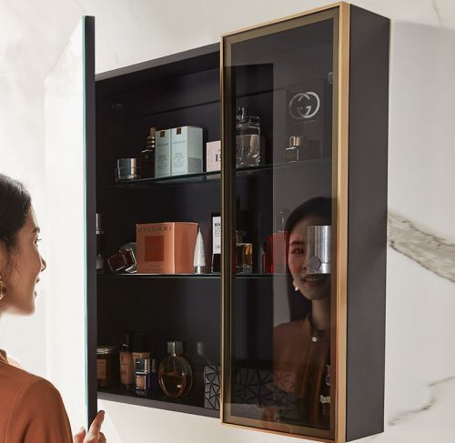例如,惠达轻奢系列浴室柜整体设计简约大方,细节处尽显雅致,处处体现高品质生活质感。这款浴室柜采用星耀黑碰撞胡桃木纹,旨在用色彩传递细腻的质感,镜柜均衡比例分割,灰玻半透明式全金属封边半镜柜,使其内部储物若隐若现,用户可以轻松识别摆放位置;体简约流畅的线条,配上金色圆润的拉手,不仅使用方便,还给浴室空间增添了几分时尚的朝气与精致的优雅。