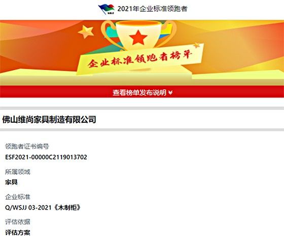 国家企业标准“领跑者”名单,是根据对重点领域内企业按照核心指标高于国家标准及行业标准的原则,由相应领域的第三方评估机构通过综合评估得出。本次为土地证的《木制柜》(Q/WSJJ 03-2021)标准评估机构为深圳家具研究开发院。