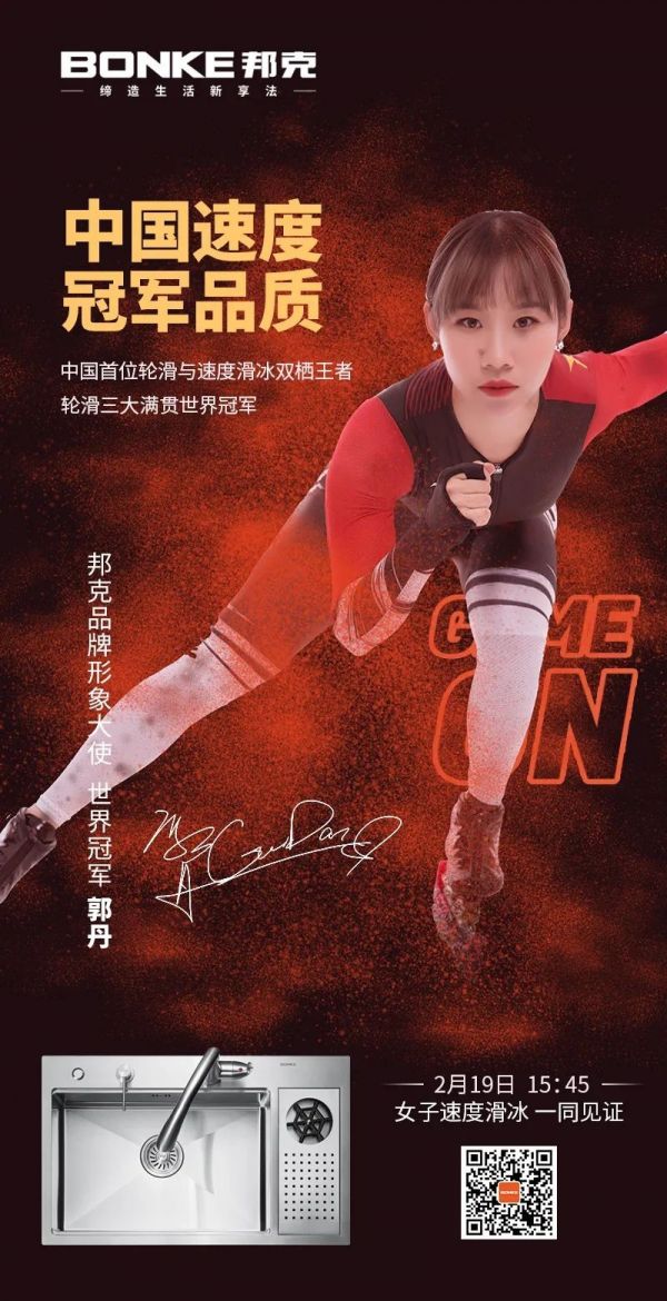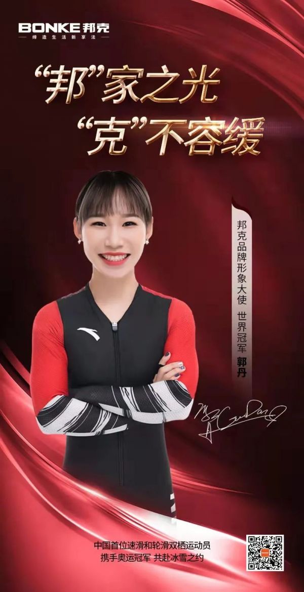2022年冬奥会期间,广东邦克厨卫有限公司正式官宣轮滑世界冠军郭丹签约,正式由郭丹担任邦克品牌形象大使。邦克携手世界冠军郭丹一起“奔赴”新的征程, “行业标杆×世界冠军”,强强联合,邦克厨卫将持续打造卓越品质;以全新的面貌再创佳绩!