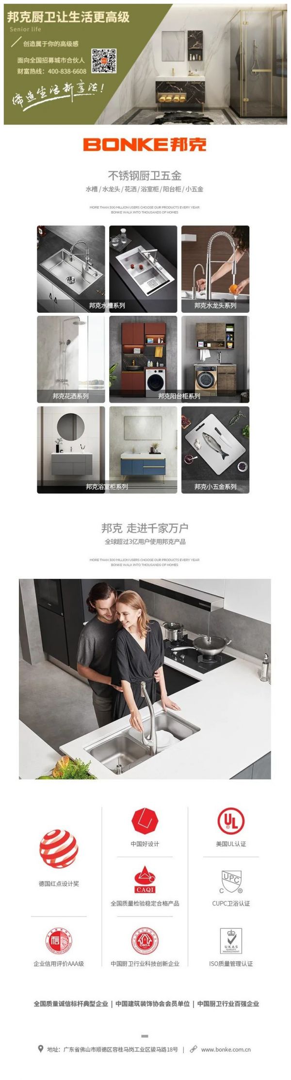 打破传统形象,产品升级换代,坚持舒适理念,邦克致力于不断为当代年轻人打造契合的生活方式,为他们构筑理想的家居生活,未来也将继续携手世界冠军郭丹开启智能家居新时代;不断深化不锈钢智能厨卫五金概念,以不锈钢厨卫为核心,智能家居生活为辐射半径,将冠军品质和年轻时尚潮流元素融入产品设计;继续坚持“用科技创新和创意思维求发展、为缔造人类健康生活而奋斗”的理念,携手郭丹一起开启冠军品质的新征程!
