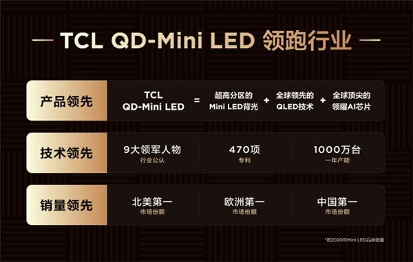 这样一种高对比度、高亮度、高色域、长寿命、大尺寸的全新显示技术,自然第一时间获得了消费者的广泛认可和选择,2021年双十一期间,TCL就凭借QD-Mini LED电视的出色表现,轻松拿下了Mini LED电视品类线上线下全渠道销量&销售额双冠军。