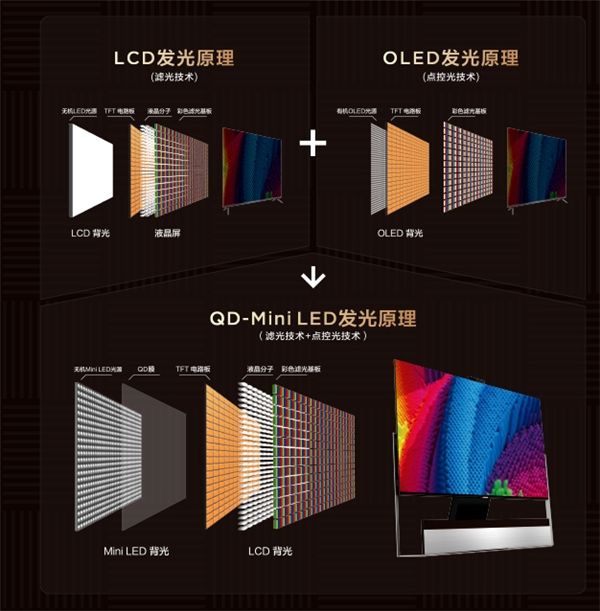 随着大众对大屏、超大屏、巨幕电视的需求不断拓展,OLED越来越难以满足大众的使用需求。因此市场迎来了全新的Mini LED技术。Mini LED是LCD、OLED之外的另一种屏幕点亮技术,与传统的LED背光技术相比,Mini LED 将面光源升级为像素级点光源,具备和OLED类似的控光精细、高对比度以及超薄等诸多明显优势。且使用寿命更长,白场表现更强、尺寸更大,成本更可控,可以说结合LCD与OLED全部技术优势。
