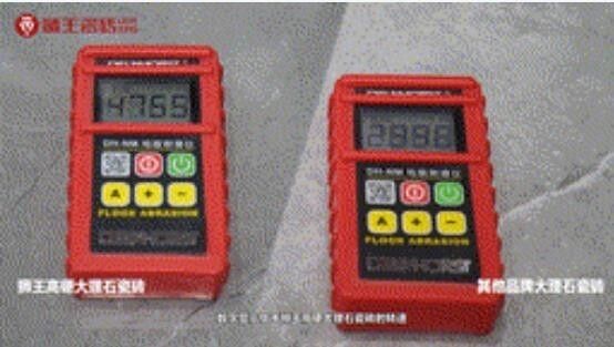 接下来我们用数据说话,先用国际DH-NM地板耐磨数字检测仪进行测试,狮王高硬大理石瓷砖耐磨度为4700转,友商瓷砖产品耐磨度为2400转,差异明显。