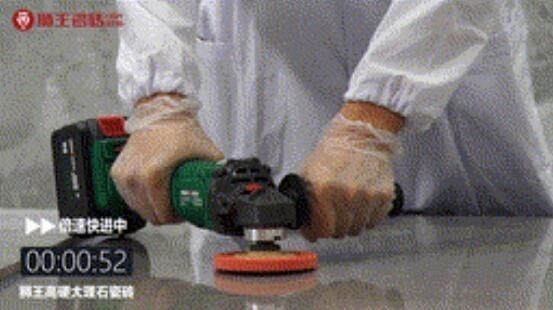 最后,我们采用更为暴力的方式对狮王高硬大理石瓷砖进行破坏性测试,用专业磨光机对瓷砖表面进行打磨破坏,通过长时间打磨,我们可以看出,狮王高硬大理石瓷砖表面已出现轻微摩擦痕迹,而友商产品已出现大面积划痕。