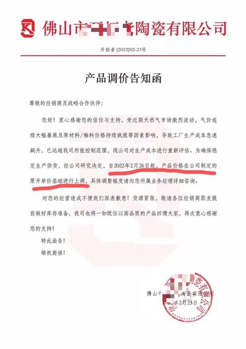 新浪家居陶卫频道讯 2月23日,广东又一家陶企宣布产品调节告知函。该公司的函告内容显示,自2022年2月26日起,产品价格在公司制定的原开单价基础上进行上调,具体调价服务向所属业务经理咨询。
