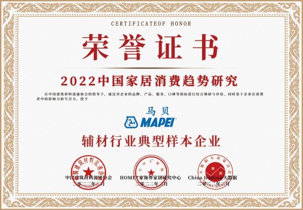 2月25日,备受行业关注的2022中国家居消费趋势研究暨行业典型样本企业成果正式发布,MAPEI马贝凭借突出的表现,入选中国家居消费趋势研究“辅材行业典型样本企业”,同时获得“消费者喜欢的瓷砖胶品牌”及“消费者喜欢的填缝剂品牌”。