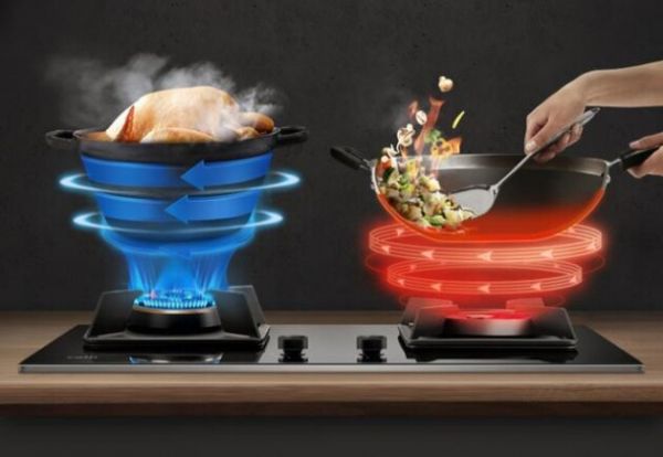 右边文火炉头拥有5.0kW的高功率,其热效率也达到65%,搭载的“蓝色聚中直火”三层进氧燃烧技术,火焰小而稳。再加上一体飞碟式悬浮聚能盘炉头设计,能够将从火焰中释放出来的热能集中在锅底,强化锅的均匀热量,防止人们在烹饪时产生“夹”现象。