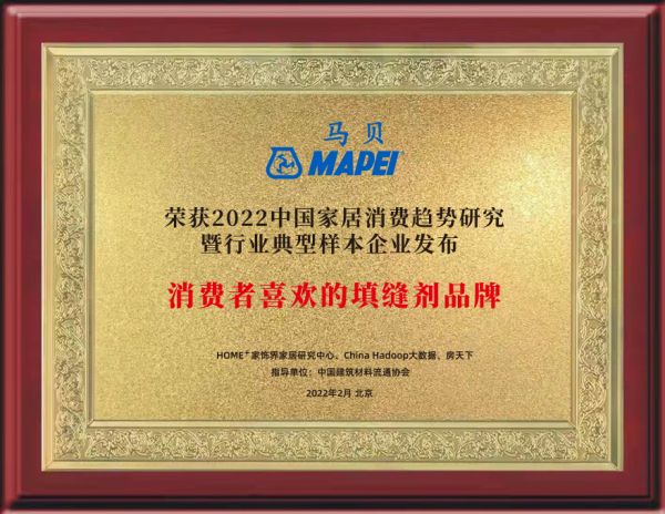 马贝荣获2022中国家居消费趋势研究消费者喜欢的填缝剂品牌