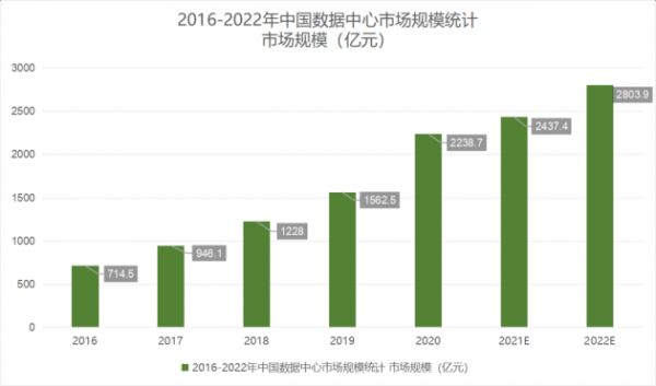 近年来,数据中心市场规模迅猛发展。根据《能源数字化转型白皮书(2021)》,我国数据中心市场规模从2016年的714.5亿元快速增长至2020年的2238.7亿元,预计2022年将增长至2803.9亿元。