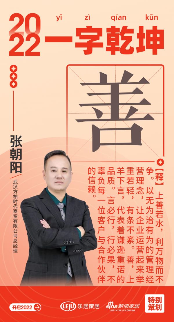 “乐业安居”是中国人最为共情之处,湖北家居人深谙汉字对于国人、对于企业的非凡意义,武汉新浪家居战略合作伙伴、家居行业优秀代表:武汉方柏时代商贸有限公司总经理 张朝阳,以「善」字打开新年仪式感。