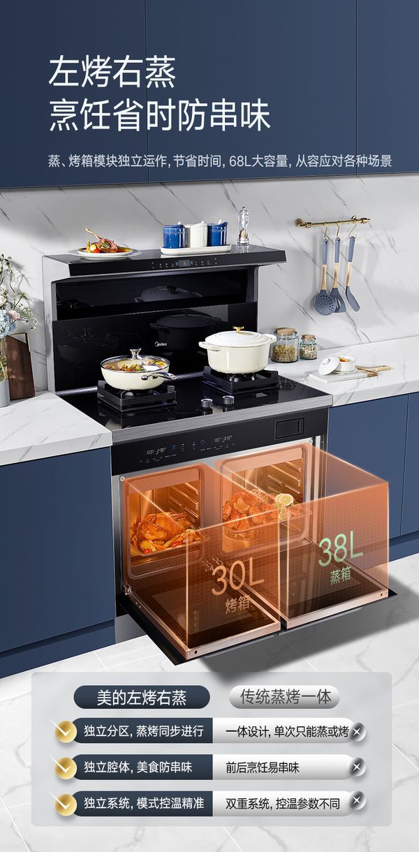 如此种种,美的顶侧双吸集成灶LS5给出了新的解决方案,通过采用左烤右蒸的双腔结构新形态,独立系统让控温更精准,专区专用让美食不串味。无论是蒸煮锁鲜,还是香酥炙烤,都是一场味蕾的征服之旅。