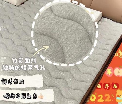 这款床垫价格处在中间档位,性价比较高。它的正面是灰色的竹炭面料,摸上去很柔顺亲肤。床垫表面这种波浪形的裥花,触感十分柔软,当你躺下来的时候,可以感受到像棉花一样的包裹,舒缓你的身体重力,很适合体型偏瘦的人。