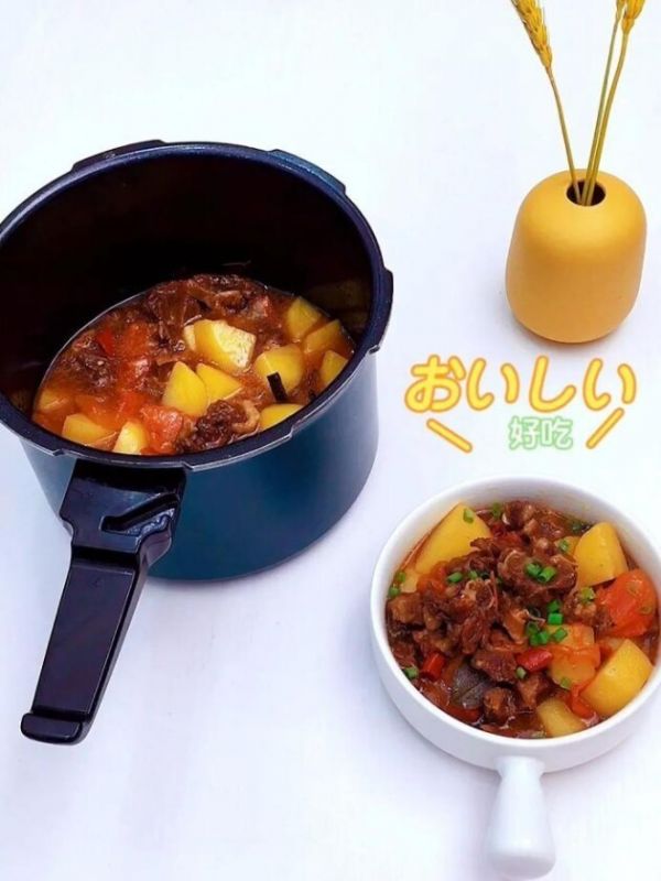 首先是土豆西红柿焖牛腩,因为牛腩本身就难煮,用电饭煲或者其它锅具,煮到牛筋嚼得动程度一般也要一个小时以上。牛腩焯水后加入香料直接开煮,上气后5、6分钟,就已经有肉香飘出来了,因为,我们多煮了一会,到15分钟左右才关火。牛腩吃起来鲜嫩又有嚼劲,而且还没腥味,土豆和西红柿吸收了汤汁的香味,简直是太好吃了。