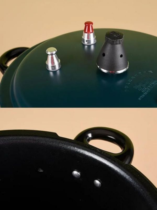 其次是红色的止开安全阀,当锅内压力升至40kPa时,止开阀上升,此时锅盖手柄锁死,是打不开的,就是为了防止烹饪过程中被意外开启。另外,当锅盖顶部的限压阀排气孔堵塞或失效时,蒸汽将会从安全阀排出。