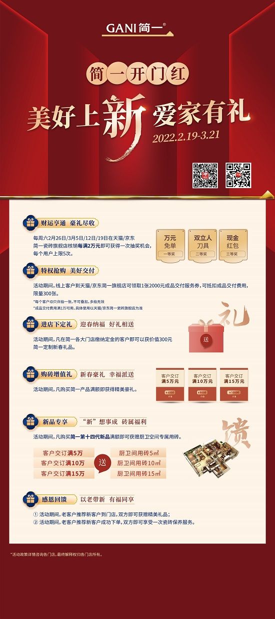 用极致的产品和服务来回馈消费者的信赖是简一的初心,除了令人惊艳的新品系列,今年开门红活动重磅开启线上线下六重福利,下定有礼、购砖有礼、上新有礼、感恩有礼以及线上万元免单大奖、成品交付特权礼劵等等,广大消费者朋友可前往当地门店了解活动福利。