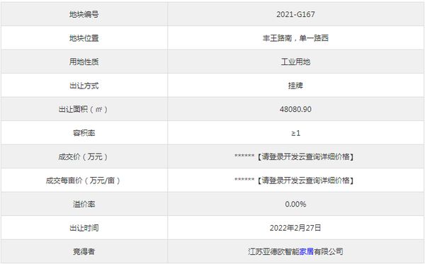 智能快讯|江苏亚德欧智能家居有限公司以底价竞得徐州市1宗工业用地