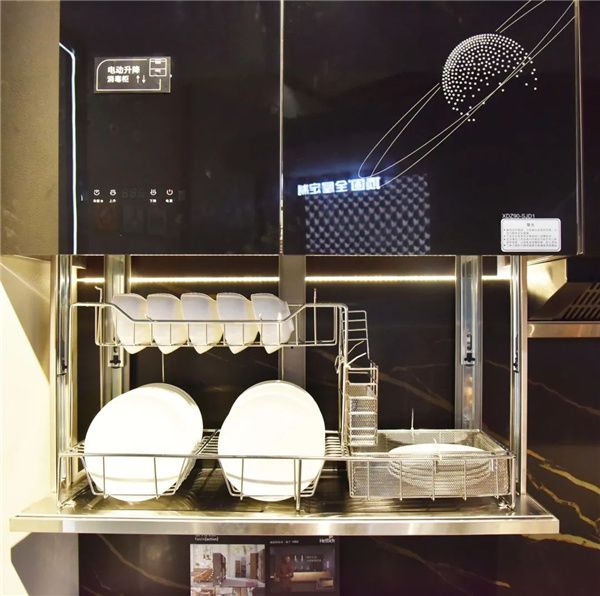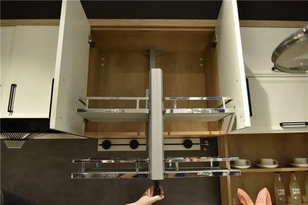 领尚橱柜在吊柜内安装下拉拉篮,开柜后将拉篮往下拉,无需踮脚即可轻松够到物品,还可选择自动升降吊柜,一键即可将物品送到眼前,便捷又安全。