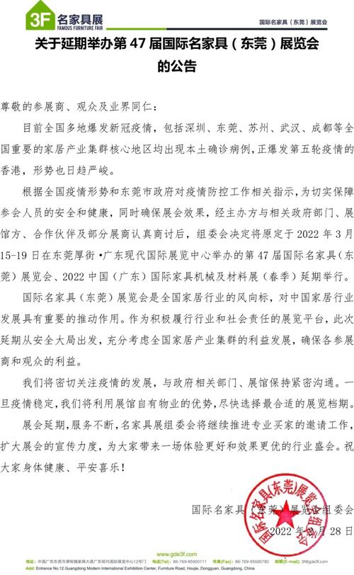 新浪家居陶卫频道讯 据国际名家具(东莞)展览会组委会2022年2月28日发布的官方消息,原定于2022年3月15号举办的47届国际名家具(东莞)展览会,由于国内及东莞疫情原因,将延期举办,具体时间待定。