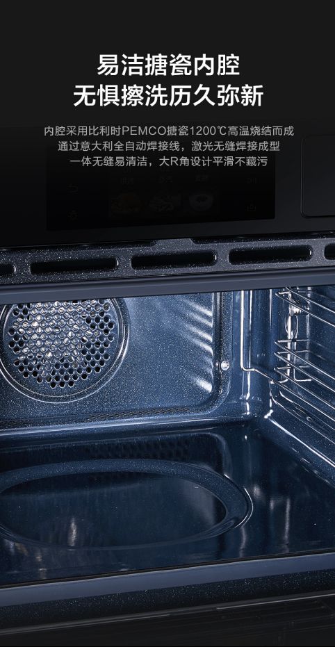 受制于成本与技术限制,传统嵌入式蒸烤箱多采用不锈钢内胆,但随着使用时间累积,内部易发黄,油渍干结之后难以清理,甚至会深入腔体缝隙。美的Q5 Pro为用户提供了一种新的解决方案——采用易清洁、耐刮花的搪瓷材质内胆。内胆表面采用比利时PEMCO搪瓷粉,肌质细腻光滑,油渍一抹即可轻松去除;得益于搪瓷高硬度、抗刮花的材质特点,即使长期使用也能亮洁如新。同时,其采用意大利进口全自动无缝焊接工艺,内胆一体成型,无缝隙设计拒绝藏污纳垢,更加干净卫生。50L理想内腔容量,能轻松放下龙虾、披萨等大件食材,轻松满足家庭聚餐需求。