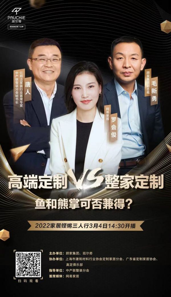 2022年3月4日14:30,顾家集团/班尔奇发起以“高端定制VS整家定制”为话题的“家居铿锵三人行”栏目,顾家集团副总裁毛新勇、中产联整装分会秘书长唐人、网易家居华东区主编罗会俊将继2021年“打造烟火气的高定品牌”话题之后,再次开启行业经销商最为关心的话题:做高定还是做整家定制?鱼和熊掌,是否兼得?网易家居现场直播,敬请期待。