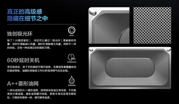作为一款高端吸油烟机产品,5915S还首创拢烟翼结构,牢牢锁住油烟并加速劲吸,大幅提升净烟效率。26m³超大风量让你告别爆炒时油烟吸不净,杰出的1060Pa最大风压,无惧阻力通畅排烟,让你在空气通透没有烟味的厨房大显身手。多维降噪技术使其调至高档也仅有48db,声音甚至比煸炒食材的声响还要小。操作上,挥挥手即可随心掌控风量,手上油渍不染油烟机,不仅有了新乐趣,更避免油渍沾染指尖的糟糕触感。烹饪结束后,按下关机键即可离开厨房,油烟机将继续工作60秒吸净燃气灶区余烟,省心更方便。