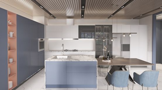 在《海流中的岛屿》中,海明威借主人公之口这样描写他平时必须加双份朗姆酒的得其利:“端起一杯结满冰霜的得其利,清澈透亮,仿佛行至浅海时船头切开的白浪。”文字里流露出一种不多见的小资做派的蓝调风格。其实,蓝调不止是布鲁斯的沉郁,还是夏天的味道。从大海吹过来的海风是蓝色的,从天空照射过来的阳光是蓝色的,吃进嘴里的每一口美味都是蓝色的。这种色彩的文化基因植入家居之中,成就了柏厨蓝调的厨餐厅空间设计。
