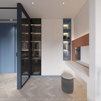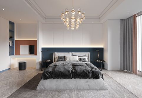如果家是心灵的归属,那么卧室就是我们的归宿。灰玻收纳柜合理利用主卧玄关空间,拒绝沉闷让空间显得更加通透。蓝白撞色护墙板搭配暖光灯设计,让你尽享舒睡氛围,一身轻松进入梦乡,做一个幽蓝的甜蜜的美梦。