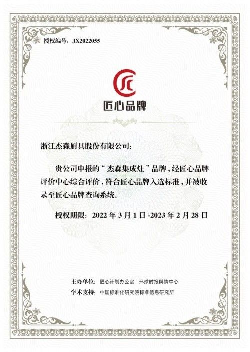 本次品牌匠心评选侧重考察企业价值观和文化精神内核,企业对于品牌质量文化、创新文化、服务文化的建设管理,以及企业与内外部环境的生态情况。杰森变频集成灶获此殊荣,是杰森长期践行工匠精神的必然结果。