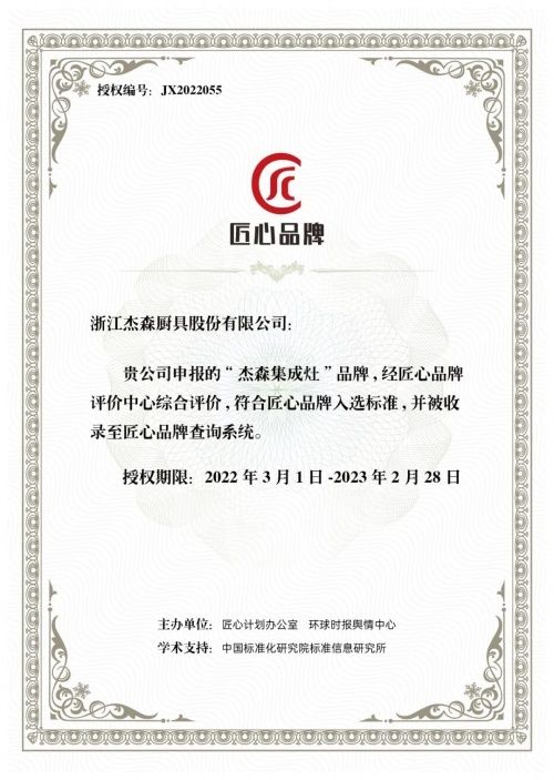 本次品牌匠心评选侧重考察企业价值观和文化精神内核,企业对于品牌质量文化、创新文化、服务文化的建设管理,以及企业与内外部环境的生态情况。杰森变频集成灶获此殊荣,是杰森长期践行工匠精神的必然结果。
