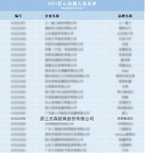 近日,由匠心计划办公室和纽约时报舆情中心联合主办的“2021匠心品牌”评选活动完美落幕,在将近300个企业共同参与的情况下,杰森集成灶成功入选并被收录至匠心品牌查询系统,成为官方认证的“匠心品牌”。