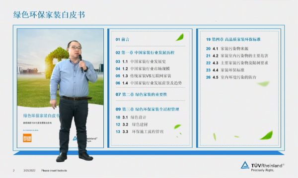 此外,德国莱茵TÜV大中华区产品服务运营中心总经理 李允表示,“通过白皮书,我们希望帮助消费者树立和加深正确的绿色家装认知,采取预防手段助益环保,并从长远的角度培养绿色生活理念。”据他介绍,《绿色环保家装白皮书》基于现行国家标准,以“中国家装发展历程”、“绿色家装的重要性”、“绿色家装全过程管理”和“高品质家装环保标准”四个纬度进行阐述,彰显了绿色环保家装的重要性,让更多消费者了解如何运用创新技术、严格选材和专业的工艺降低家装污染。